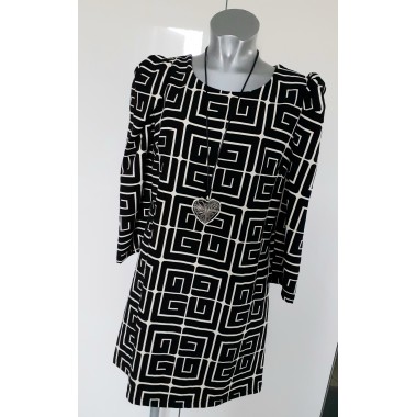 Abito corto fantasia geometrica sui toni del bianco e nero, scollo tondo, maniche lunghe con arricciatura sulle spalle, lunghezza al ginocchio. Taglia unica