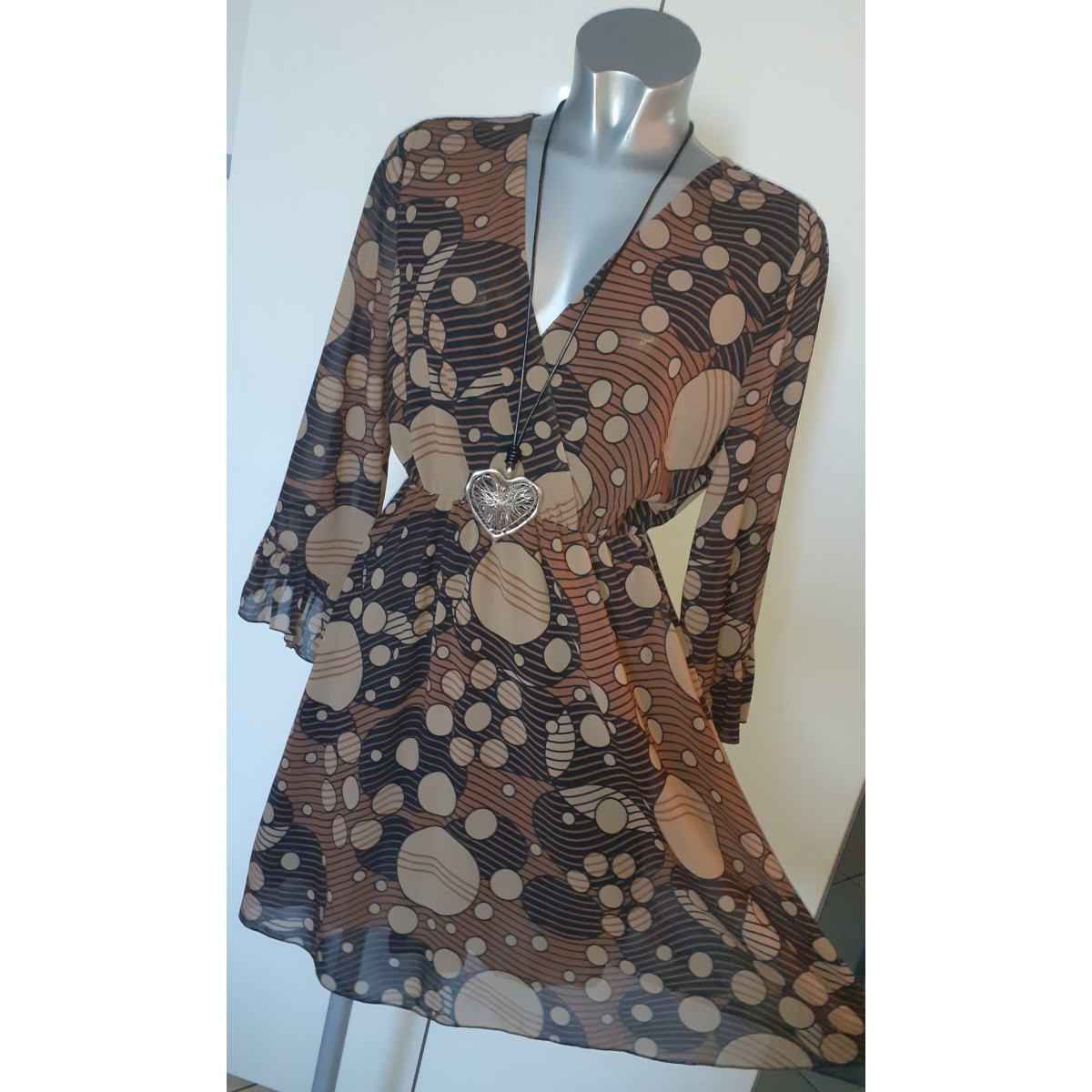 Abito corto in viscosa con fantasia a pois sui toni del marrone e beige, scollo a V profondo, elastico in vita, lunghezza dell'abito al ginocchio, taglio della gonna sciancrato. Da notare la particolarità delle maniche. Taglia unica