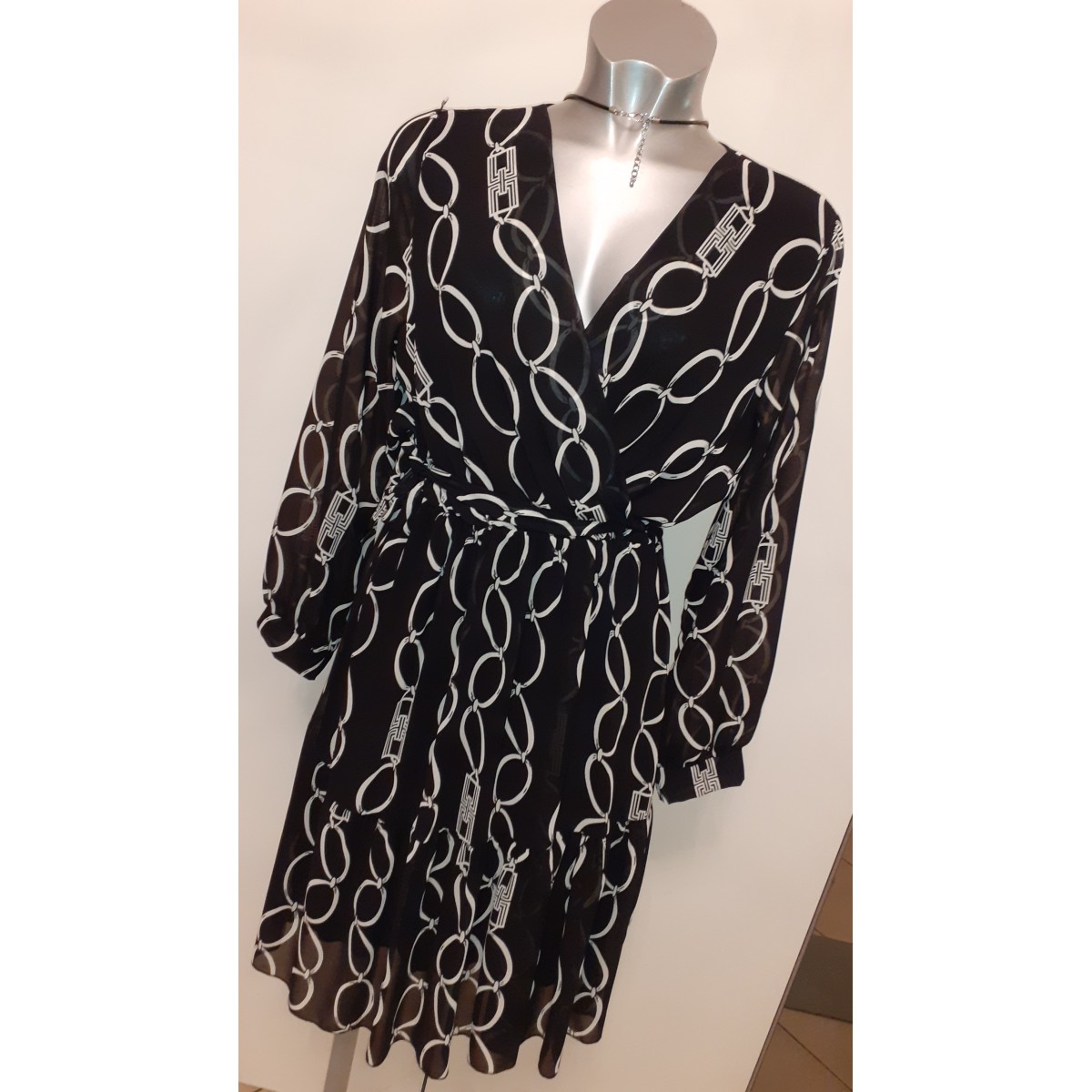 Abito corto nero e bianco a fantasia geometrica, con scollo a V profondo, elastico in vita con cinturina tono su tono, tessuto leggero cnon maniche trasparenti con bottoncino sui polsi, lunghezza al ginocchio, vestibilità slim. Taglia unica