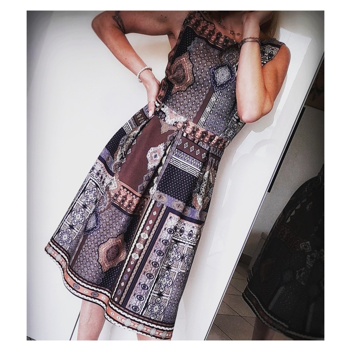 Abito smanicato a fantasia geometrica sui toni del marrone, chiusura tramite cerniera posta sulla schiena, lunghezza al polpaccio, vestibilità corpetto slim, taglio gonna svasata.