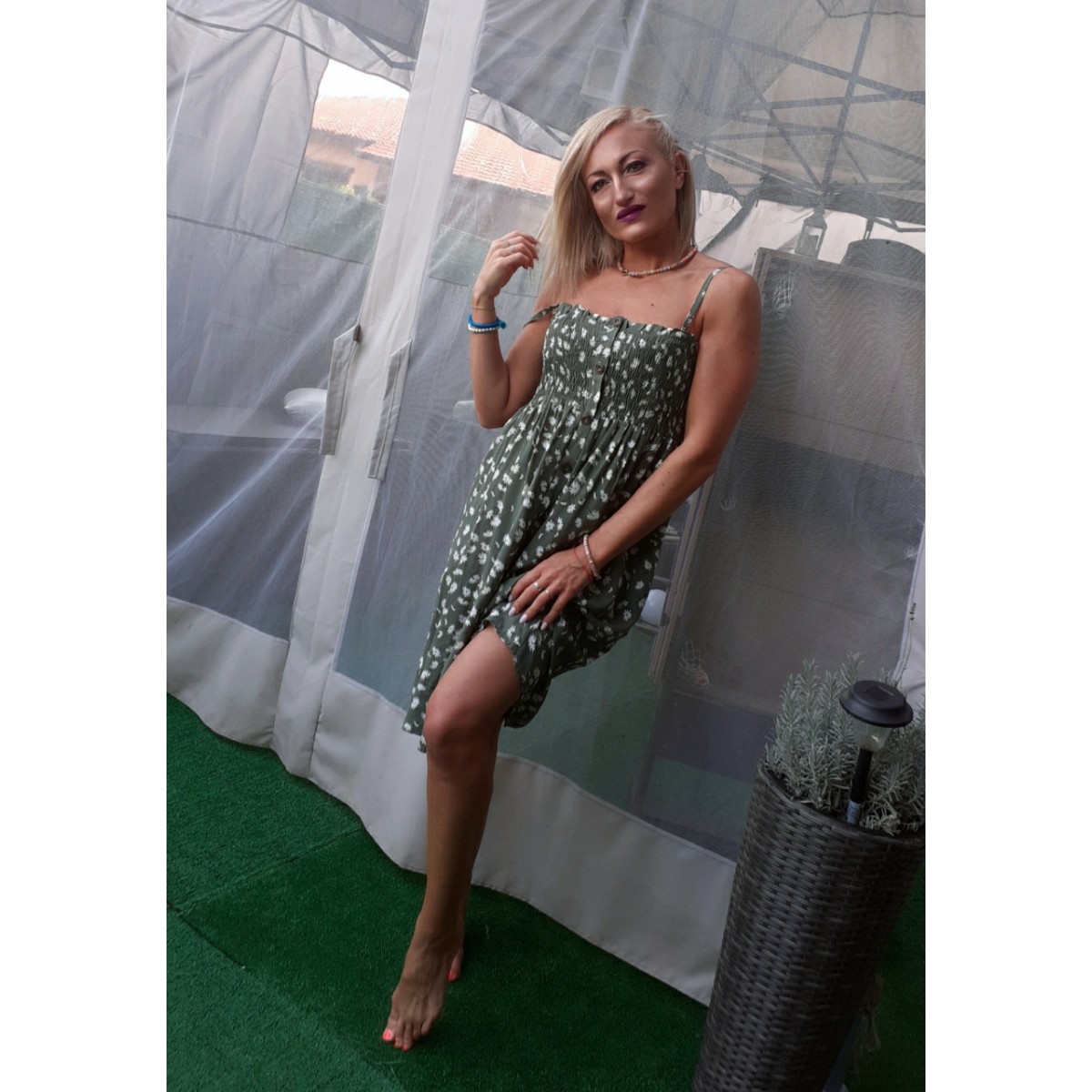Abitino corto a fiorellini bianchi su sfondo verde militare, spalline sottili, corpetto arricciato con bottoncini per tutta la lunghezza dell'abito. Vestibilità morbida. Taglia unica.