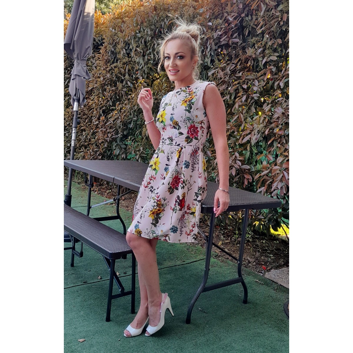 Abito corto smanicato a fantasia floreale su sfondo rosa chiaro, scollo tondo, lunghezza al ginocchio, vestibilità corpetto aderente, gonna svasata, chiusura tramite cerniera dietro la schiena. Modello molto chic ed elegante. Taglia unica