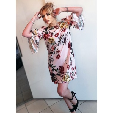 Abito corto stampa floreale su sfondo rosa chiaro, scollo tondo, maniche a tre quarti con volant, lunghezza sopra al...