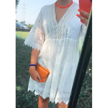 Abito corto bianco con pizzo, maniche 3/4, scollo a V profondo, vestibilità morbida, lunghezza al ginocchio....