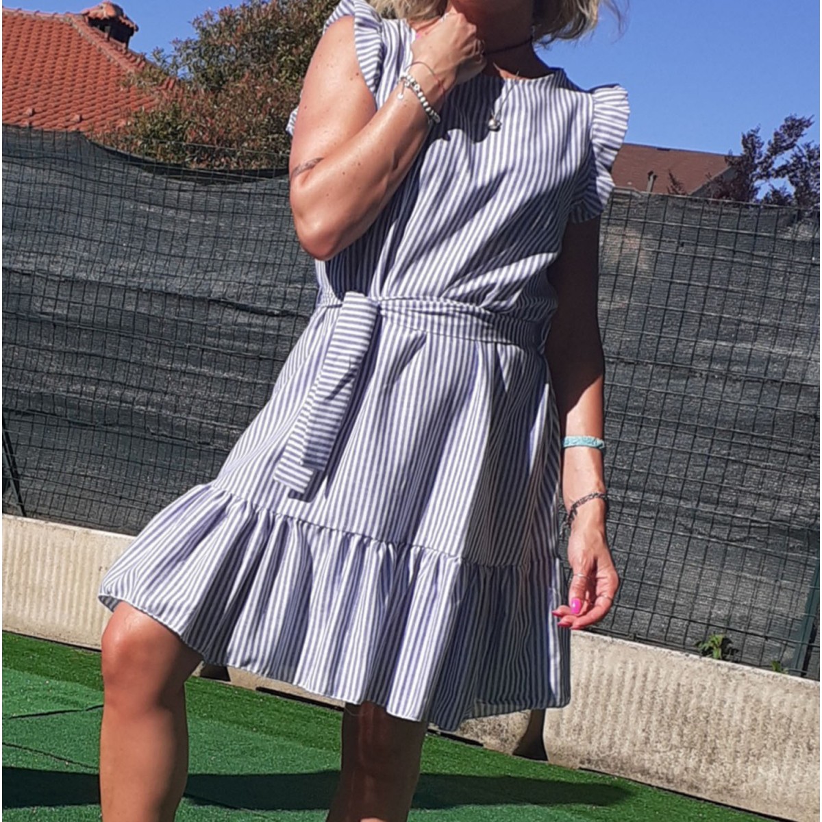 Abitino a fantasia rigata blu su sfondo bianco, 100% cotone, scollo rotondo, maniche a volant, vestibilità morbida, lunghezza al ginocchio con balza sotto, cinturina in vita tono su tono. Taglia unica.