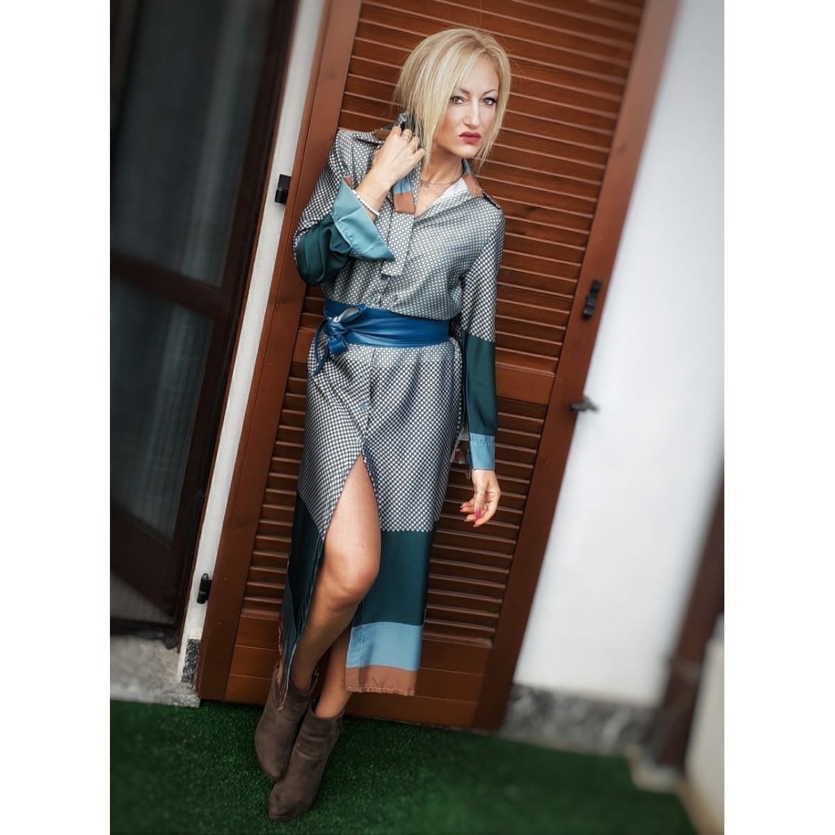 Abito lungo a scamiciato in tessuto leggero sui toni del verde, scollatura a V profondo, allacciatura tramite bottoni su tutta la lunghezza. vestibilità versatile. Taglia unica.
