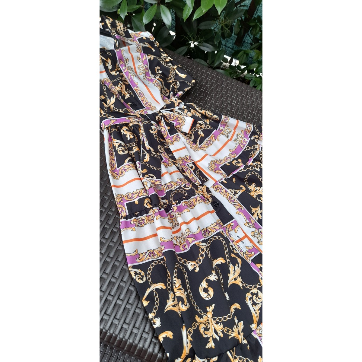Abito lungo a fantasia con scollo a V profondo con incrocio, spalline molto sottili, schiena nuda con ampia scollatura, vestibilità morbida. Modello molto sexy, perfetto per le serate estive al mare. Taglia unica