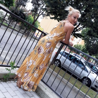 Abito lungo tutto in plissé, fantasia floreale su sfondo giallo, spalle scoperte, allacciatura tramite eleganti nastrini. Modello molto elegante e particolare, unico nel suo genere, perfetto per non passare inosservata. Taglia unica.