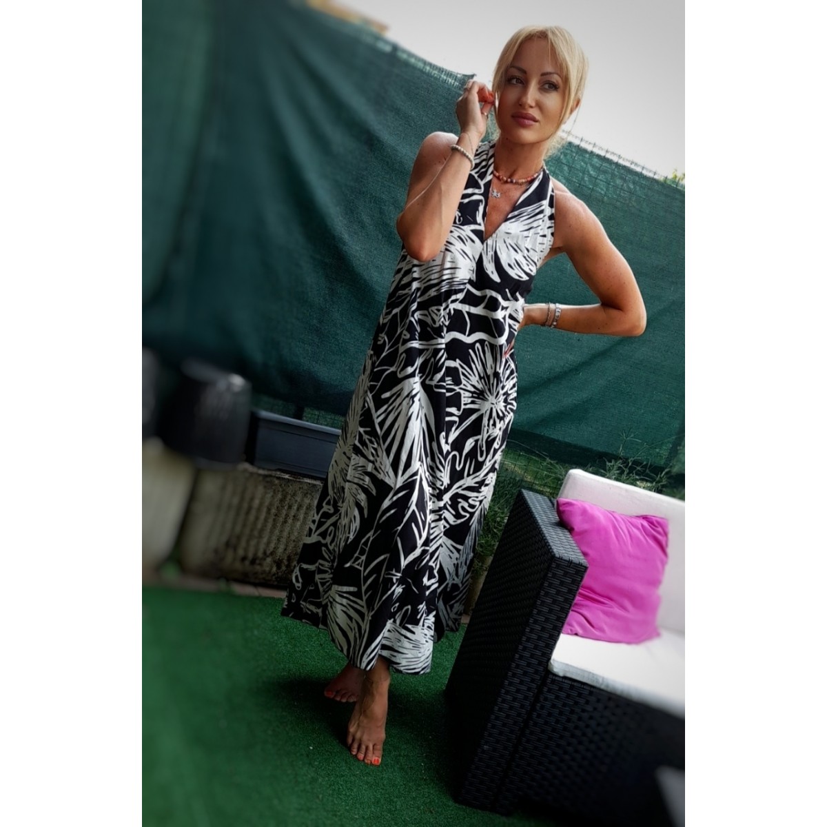 Abito lungo smanicato a fantasia floreale sui toni del bianco e nero, scollatura sulla schiena con incrocio, scollo a V profondo, lunghezza alla caviglia, vestibilità morbida. Taglia unica