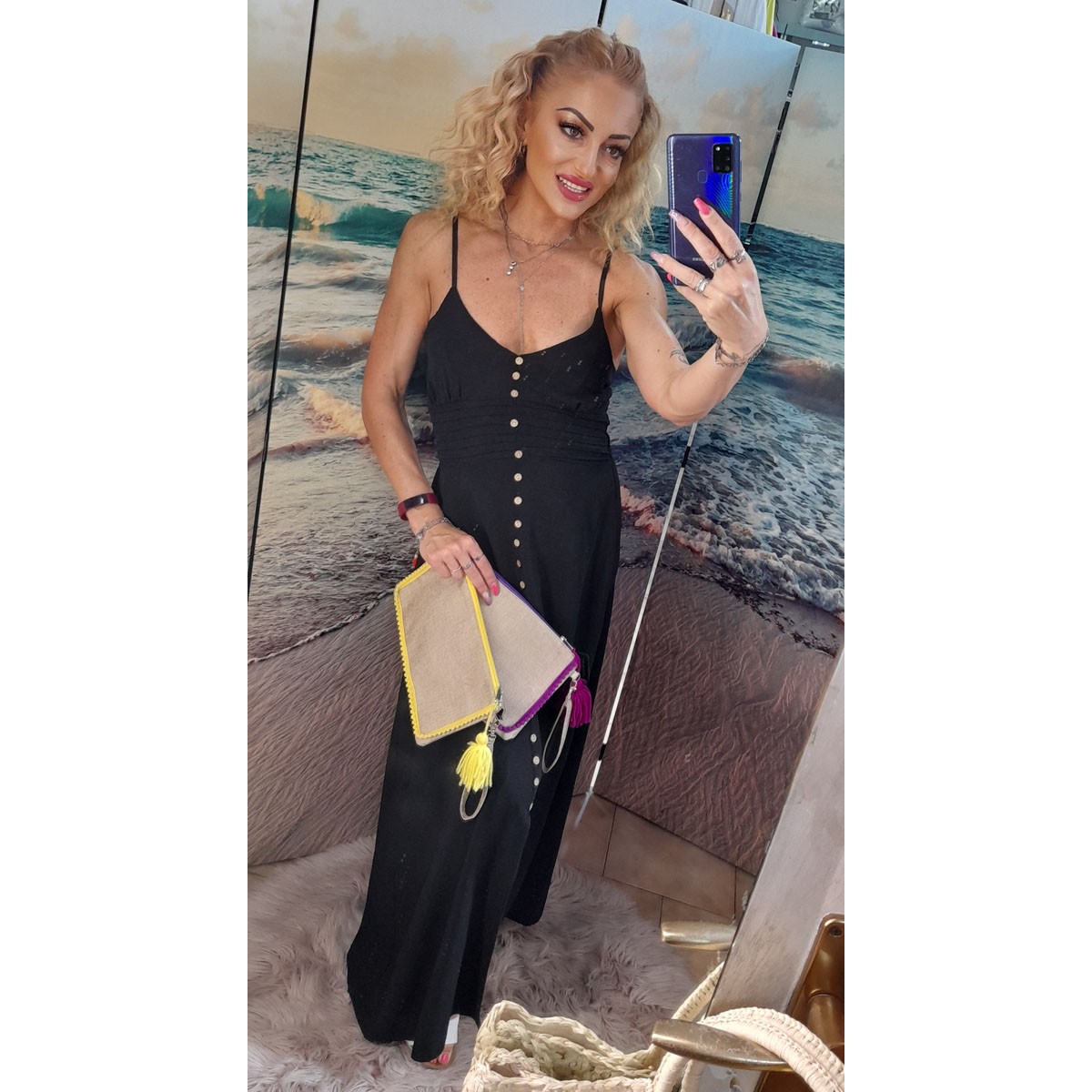 Abito lungo di cotone leggero con ampia scollatura tonda, spalline sottili, finti bottoncini sul davanti, vestibilità morbida. Taglia unica