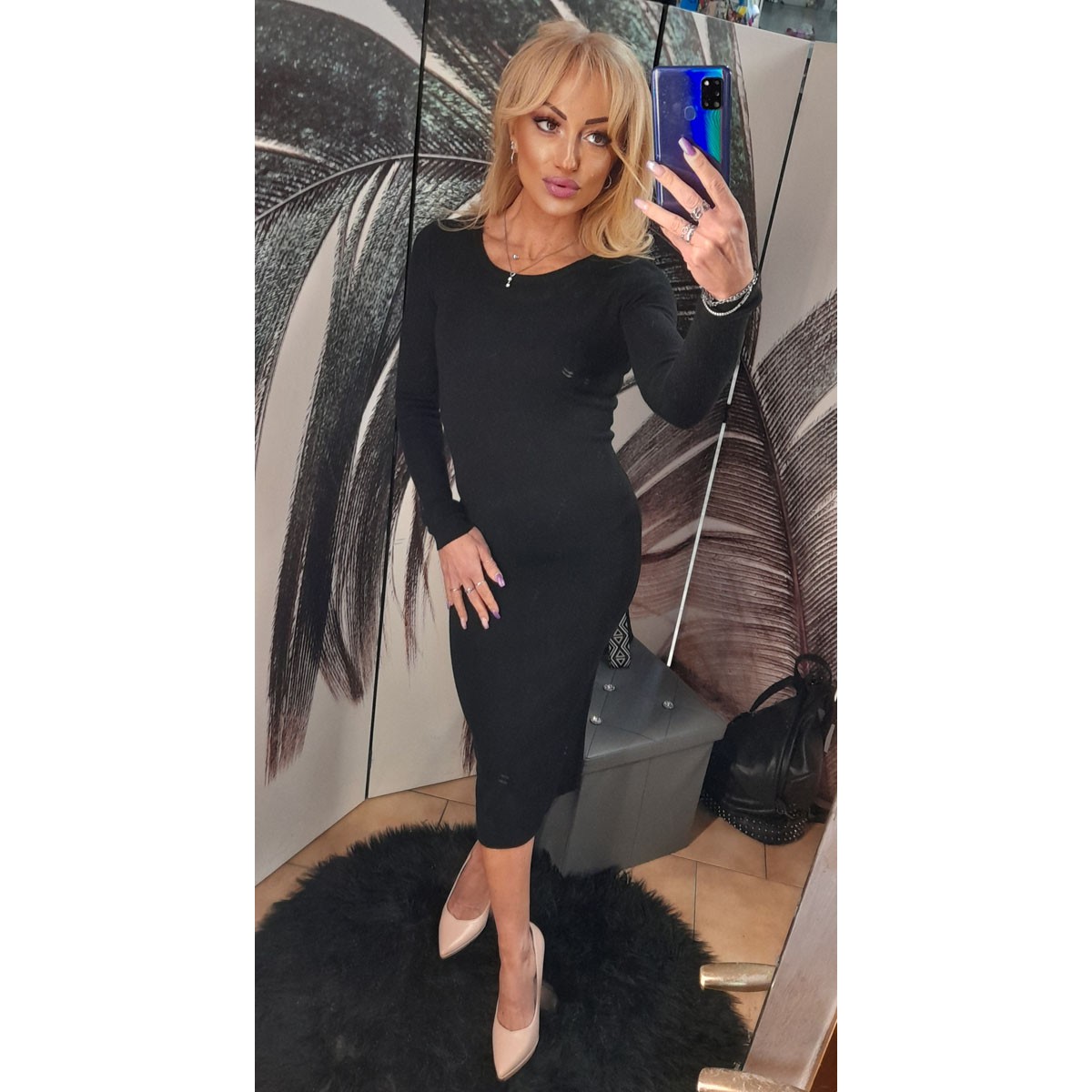 Abito lungo aderente misto lana con scollo tondo, lunghezza al polpaccio. Taglia unica