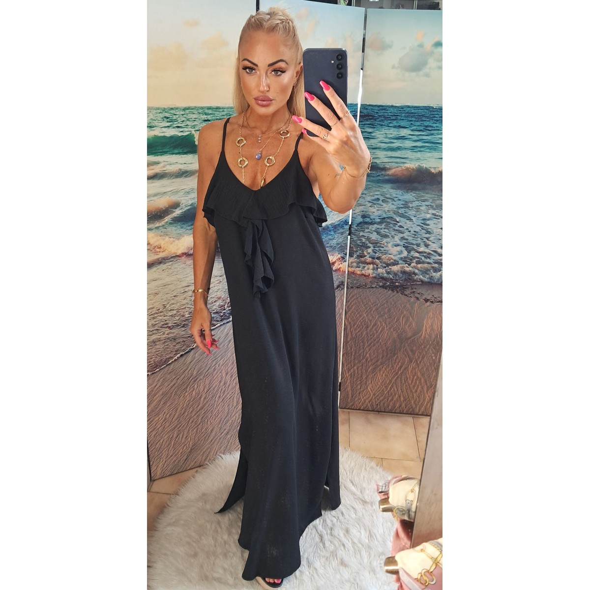 Abito lungo con balze realizzato in viscosa 100%, spalla larga regolabile con fiocco, scollo a V profondo, vestibilità morbida. Taglia unica