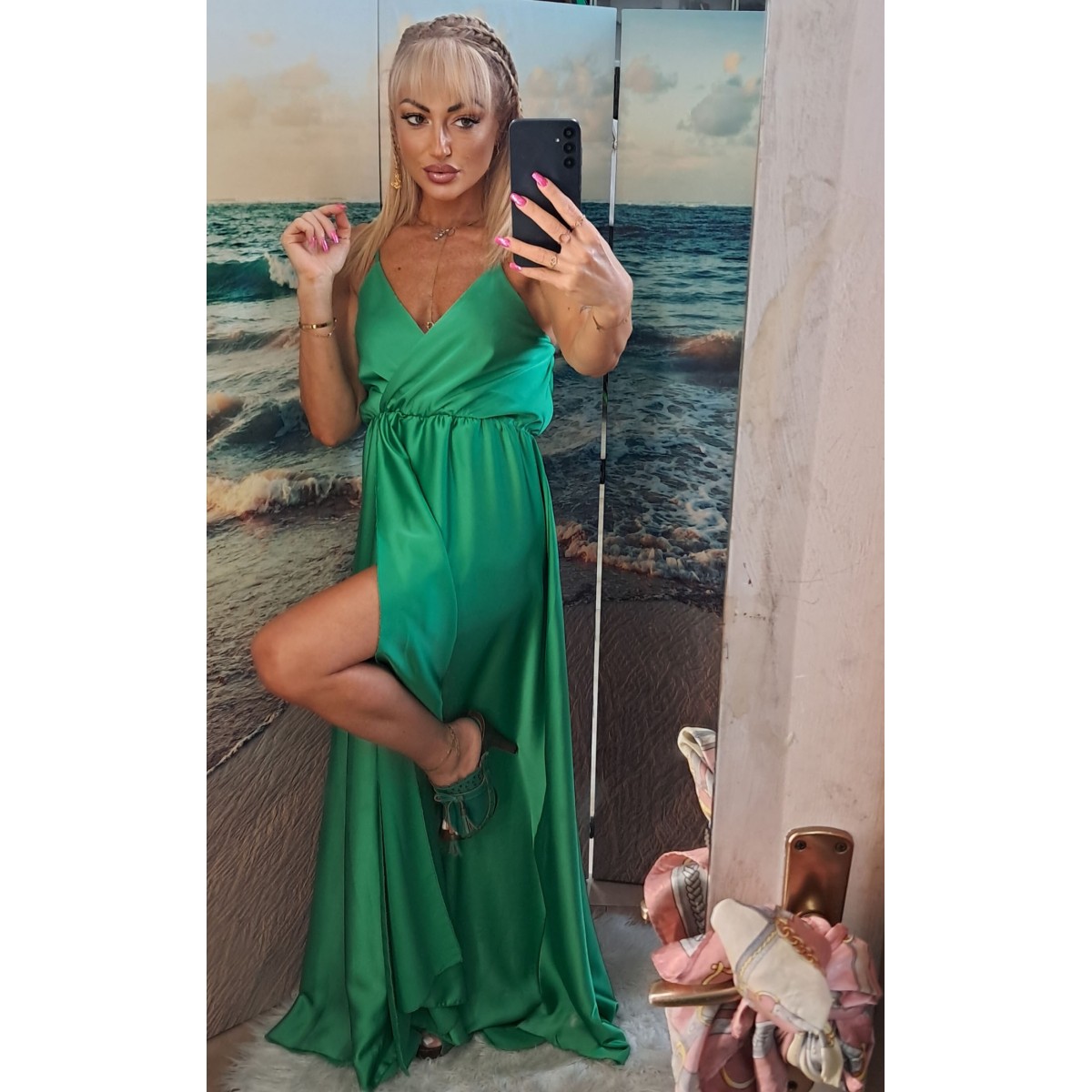 Abito lungo da sera in tessuto lucido simile al raso, con spacchi laterali, scollo a V profondo e spalline molto sottili, schiena nuda e vestibilità morbida. Modello molto sexy e seducente, perfetto per una serata speciale.