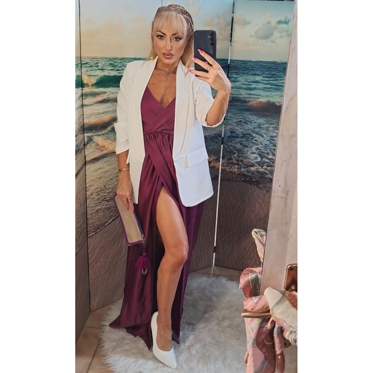 Abito lungo da sera in tessuto lucido simile al raso, con spacchi laterali, scollo a V profondo e spalline molto sottili, schiena nuda e vestibilità morbida. Modello molto sexy e seducente, perfetto per una serata speciale.