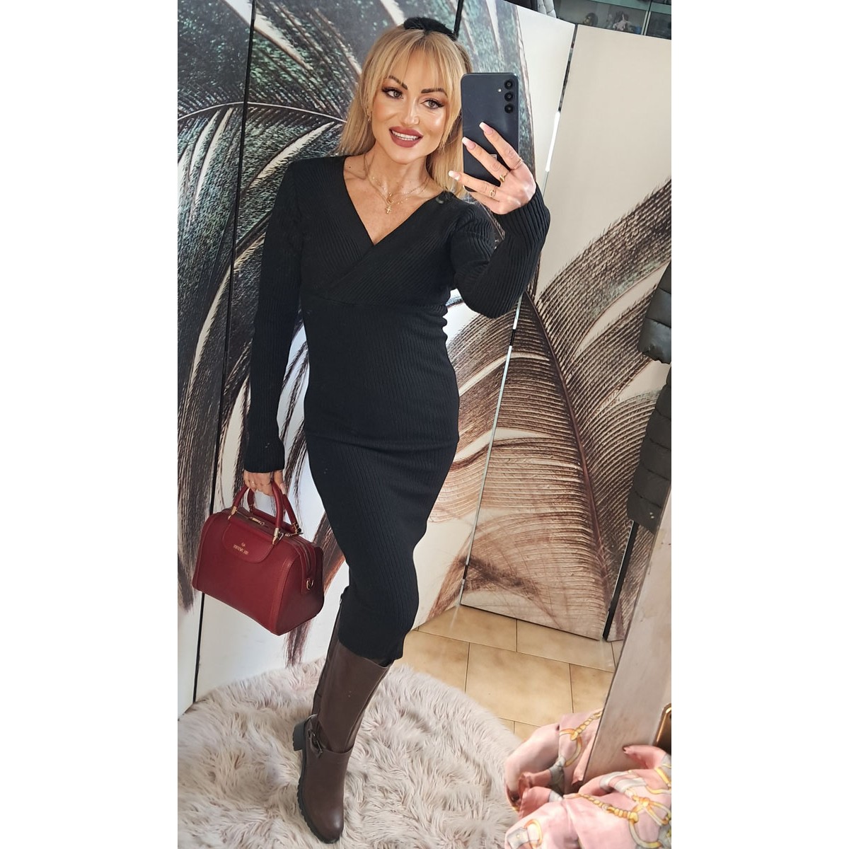 Abito longuette in lana con scollo tondo e dettaglio sulla gonna in similraso a fantasia (come in foto), vestibilità versatile, lunghezza al polpaccio. Taglia unica