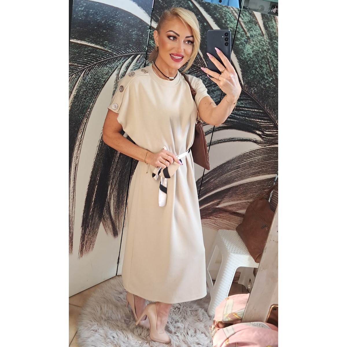 Abito lungo chic a mezza manica, girocollo realizzato in neoprene con applicazioni di bottoni dorati sulle spalle, dotato di cinturina per stringere il punto vita. Taglia unica