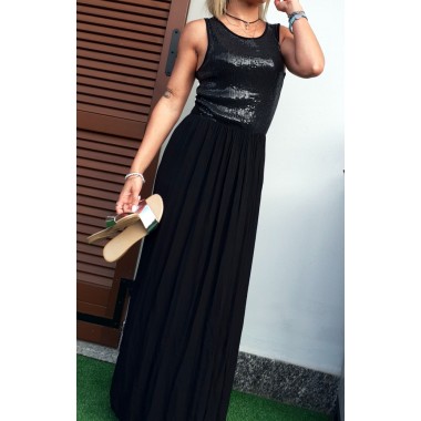 Abito lungo nero a canotta con corpetto di paillettes dello stesso colore, materiale 100% cotone. Vestibilità del corpetto aderente, gonna morbida, lunghezza alla caviglia. Tessuto fresco e leggero. Taglia unica.