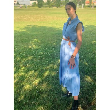 Scamiciato lungo color azzurro con balze, maniche a volant, scollo a V, vestibilità morbida, lunghezza alla caviglia, cinturina in vita. Taglia unica.