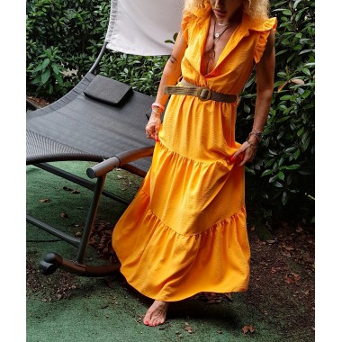 Abito lungo con ampia scollatura a V, maniche a volant, gonna lunga a 3 balze, vestibilità morbida, lunghezza alla caviglia, elastico in vita con cintura beige in dotazione. Taglia unica