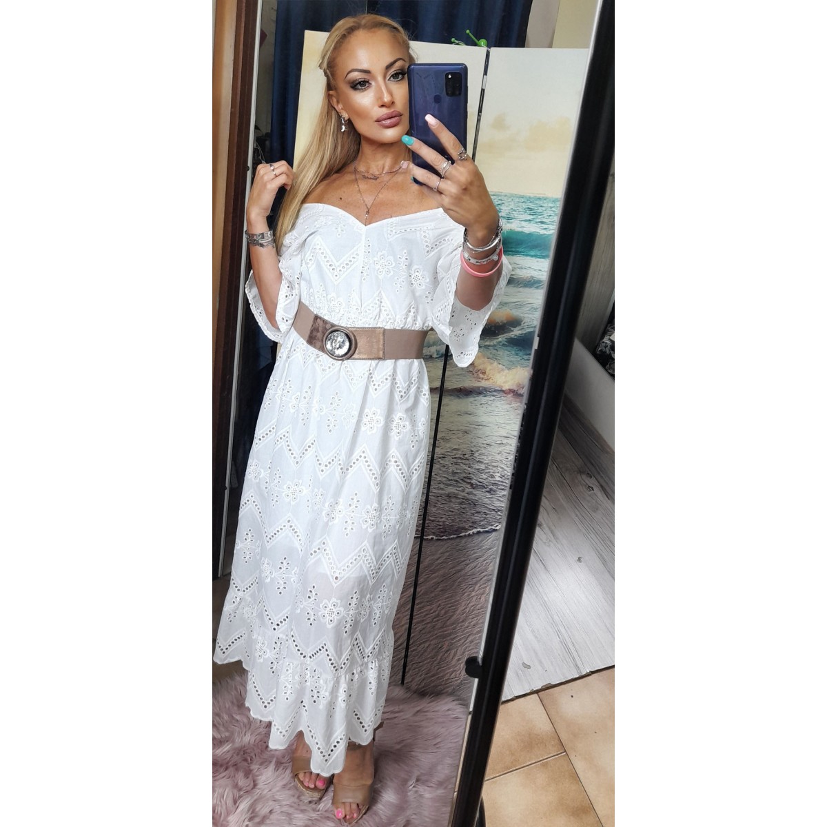 Abito lungo di cotone lavorato total white, scollatura profonda con spalle scoperte, vestibilità morbida, lunghezza alle caviglie, maniche tre quarti. Bellissimo ed originale, perfetto per il mare. Taglia unica
