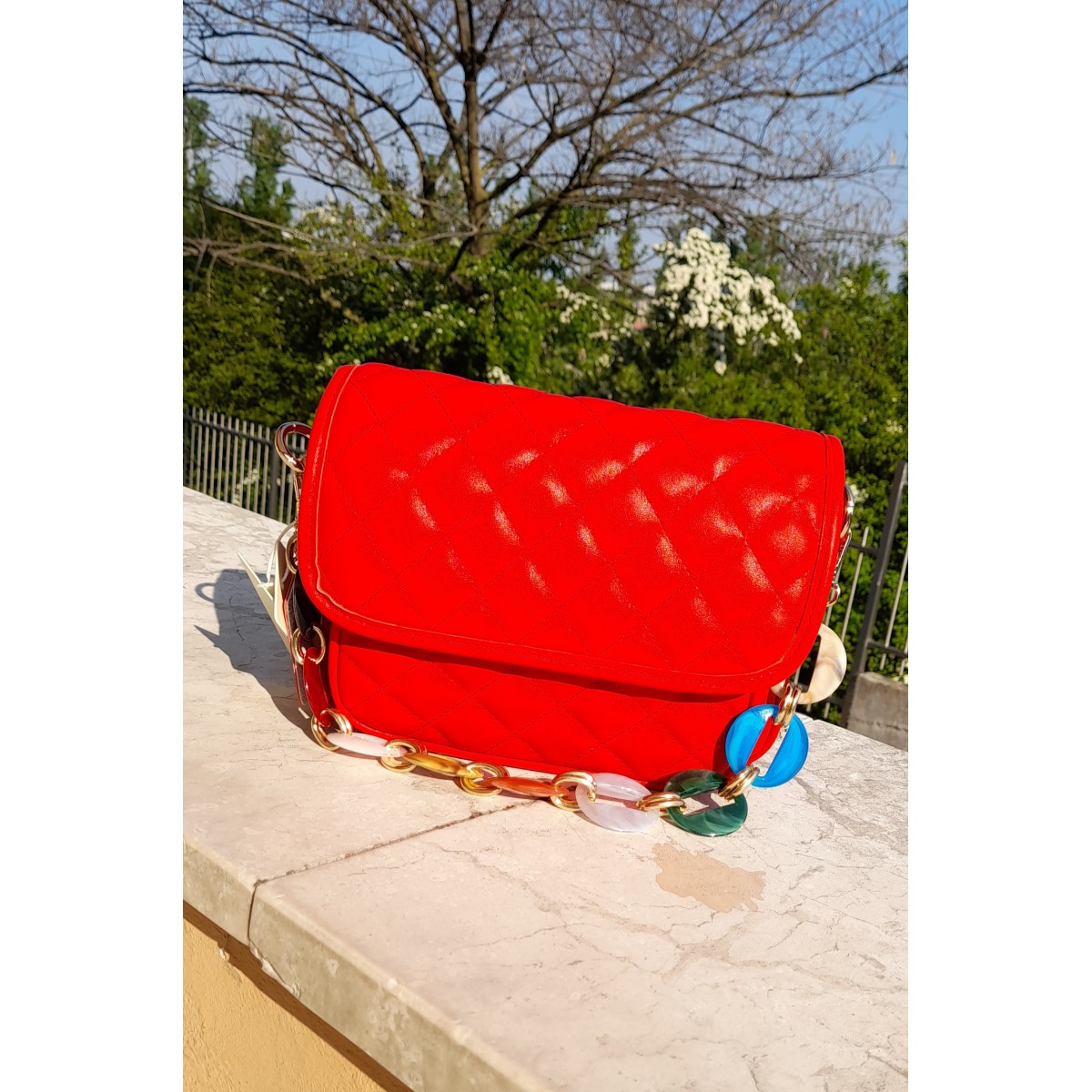 Mini borsetta trapuntata in similpelle a tracolla con catena colorata, piccola ma con l'attitudine di un accessorio pieno di carattere e personalità. Disponibile in diversi colori moda.