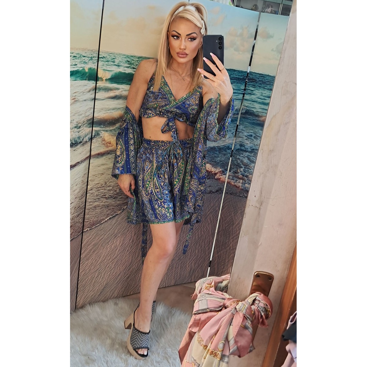 Completo a fantasia per il mare | Grace Completo estivo composto da pantaloncino in cotone leggero con coulisse ed elastico invita, top corto con spalline regolabili e kimono con cintura in vita tono su tono. Taglia unica
