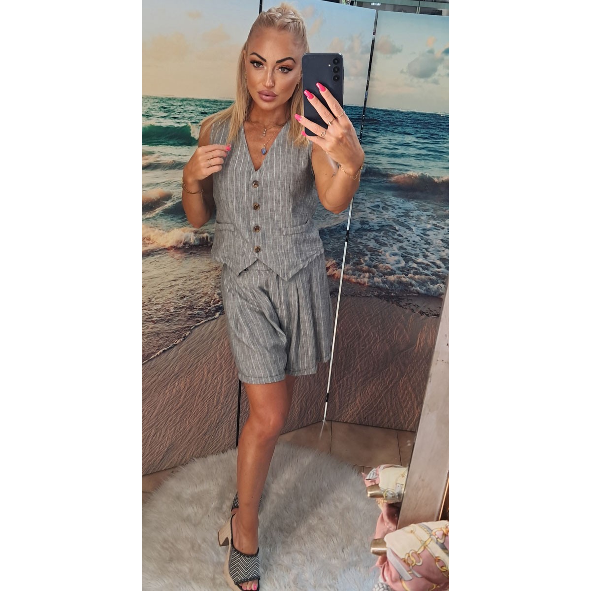 Completo coordinato 2 pezzi in cotone 100%: shorts con gilet top, elastico in vita, zip, bottone e tasche laterali. Taglia unica