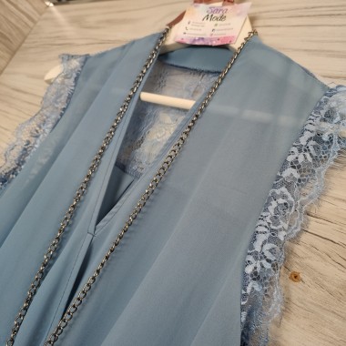 Sottogiacca da donna realizzato in viscosa, con mezza manica in pizzo. Il pizzo viene rivisto anche sul retro e rendono la maglia molto fine. Scollatura a V data dall'incrocio, solo nella parte anteriore il finale è cucito con un elastico che dona movimento. La collana non è inclusa nel prezzo.