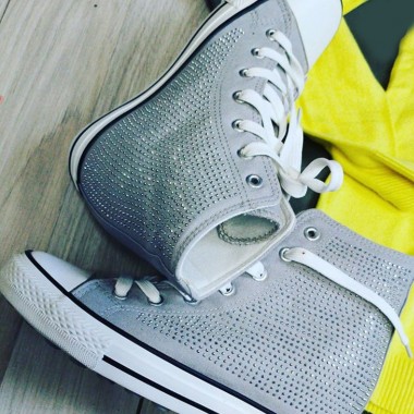 Scarpe di tela stringate modello All Star con alza-tacco, collo alto e suola in gomma, leggere e comode. Questa sneaker è caratterizzata dalla sua silhouette distintiva con rifiniture di pregio. Borchie e strass colorati la completano rendendola più chic. Stile ribelle, rocker, rapper, l'artista simbolo di stile personale.