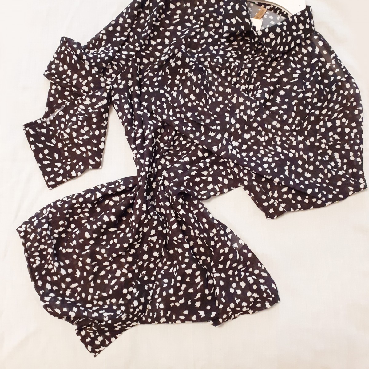 Camicetta a maniche lunghe a fantasia sui toni del bianco e nero. Vestibilità morbida, tessuto leggero, chiusura a bottoni, scollatura a V. Modello unico, chic ed elegante, dettagli ricercati. Taglia unica.
