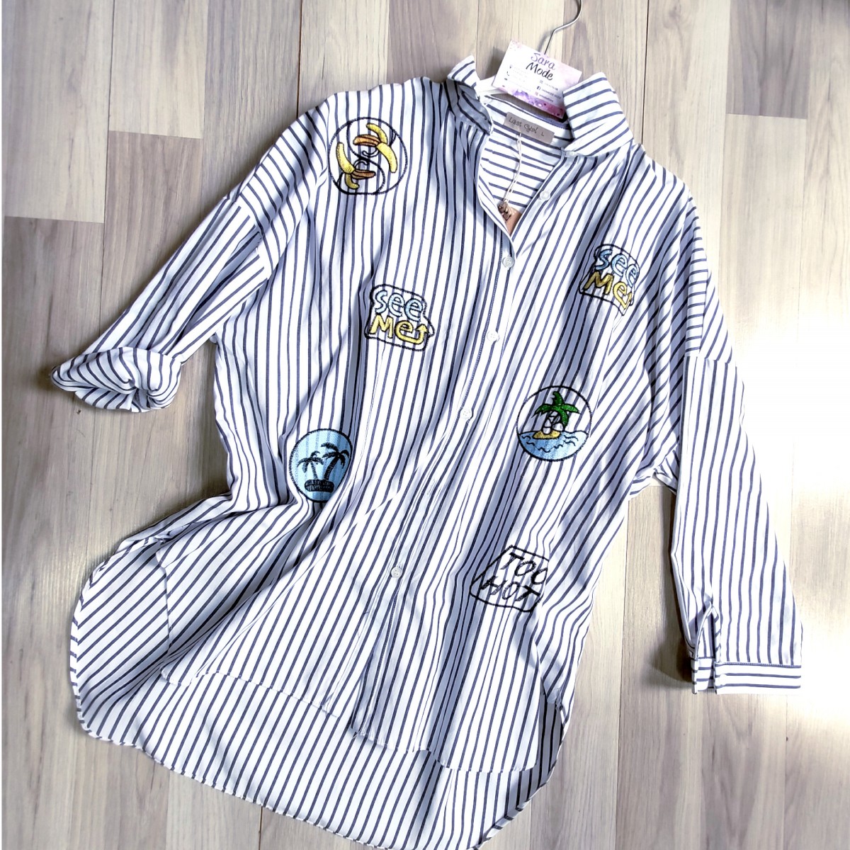Camicia da donna rigata taglio pippistrello. Collo alla francese, allacciatura in bottoni distribuita in tutta la lunghezza del capo. Particolare per i suoi ricami differenti tra loro ma somiglianti a delle patchworks. La camicia può essere indossata aperta sostituendo un blazer.