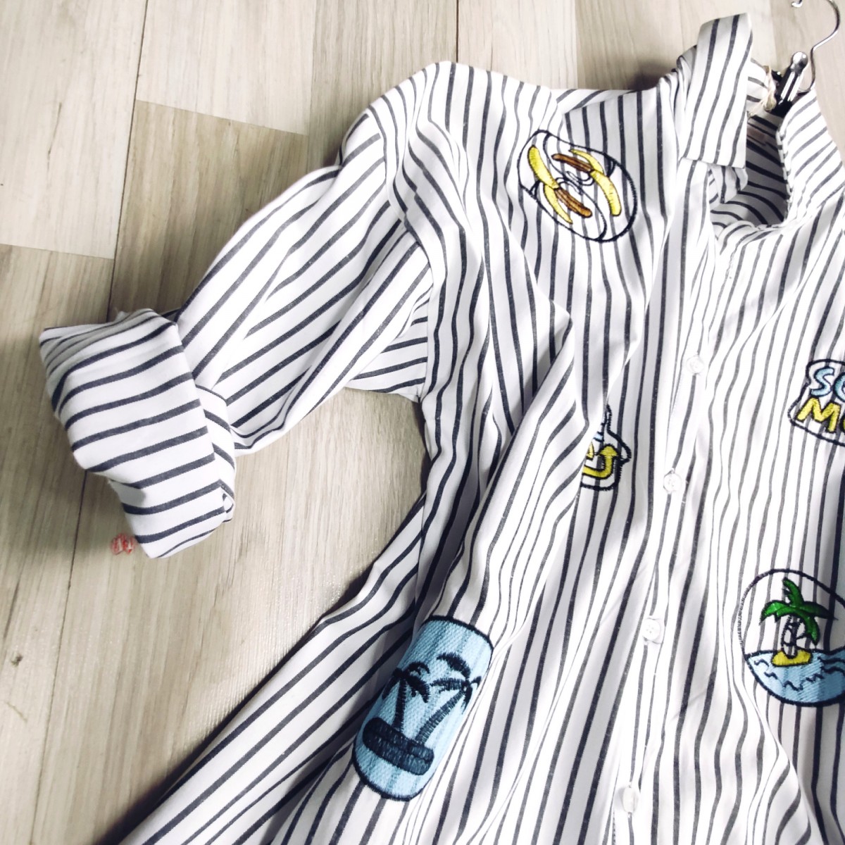 Camicia da donna rigata con taglio pippistrello. Collo alla francese, allacciatura in bottoni distribuita in tutta la lunghezza del capo. Particolare per i suoi ricami effettuati a macchina differenti tra loro ma somiglianti a delle patchworks. La camicia può essere indossata aperta sostituendo un blazer.