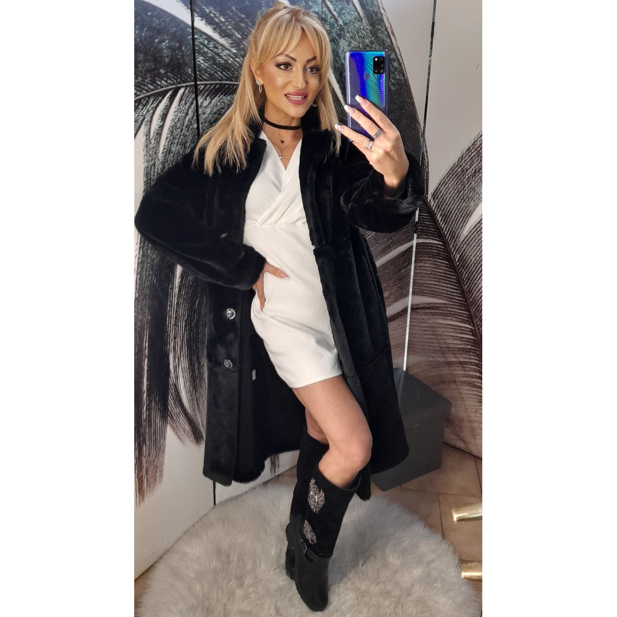 Nuovo teddy eco pelliccia lunga sciancrata con tasche laterali e cintura in vita tono su tono, vestibilità morbida. Taglia unica