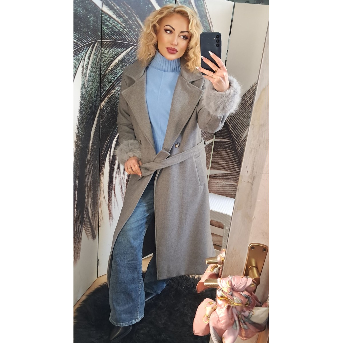 Cappotto lungo in caldo panno foderato con tasche laterale, doppio petto e cintura tono su tono. Taglia unica