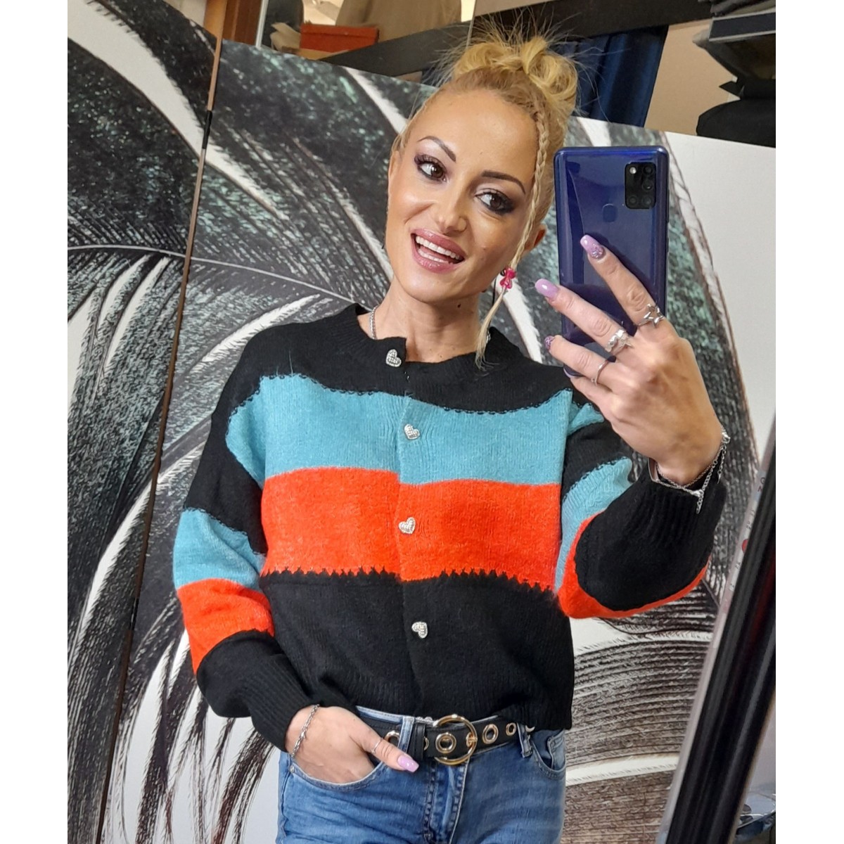 Mini cardigan a righe colorate in misto lana con scollo profondo a V e bottoni gioiello, vestibilità slim. Taglia unica