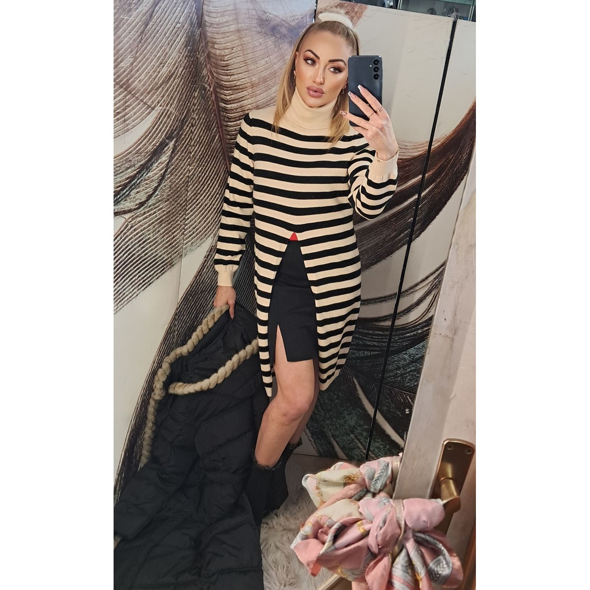 Maxi maglia misto lana a righe con collo alto a dolcevita e ampio spacco sul davanti. Taglia unica