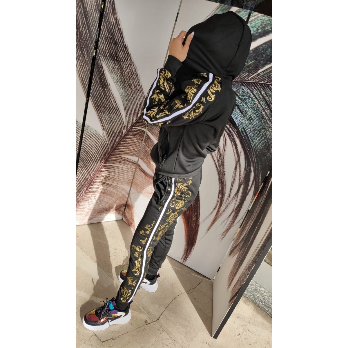 Tuta intera nera con decorazioni geometriche composta da: pantalone con tasche laterali con cerniere, felpa con cappuccio, tasche laterali e chiusura con zip. Vestibilità slim. Modello unico nel suo genere, un vero must-have.