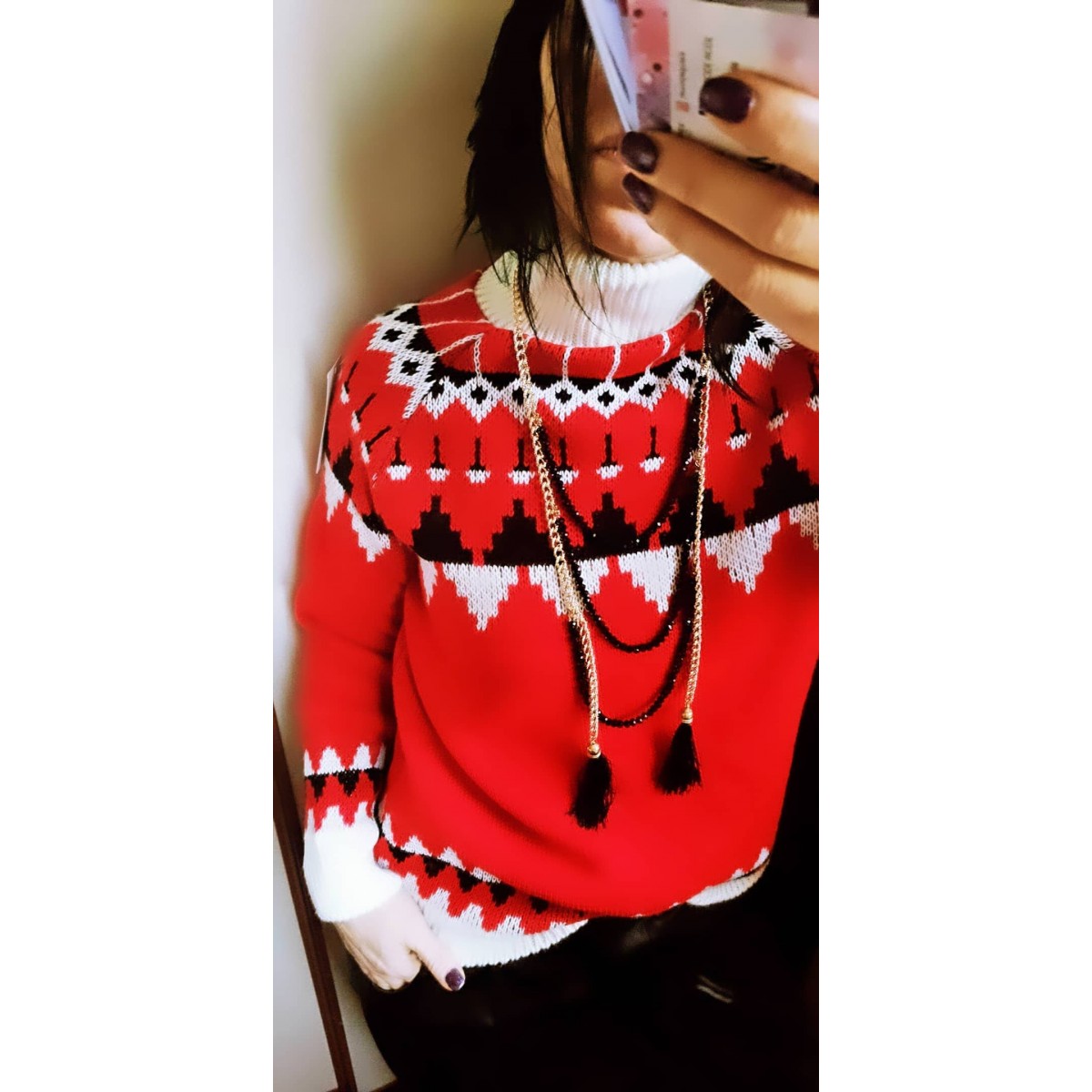 Maglione di lana jacquard a fantasia con greca colorata, collo alto, vestibilità morbida. Look perfetto per l'inverno con un jeans o pantalone nero. Taglia unica