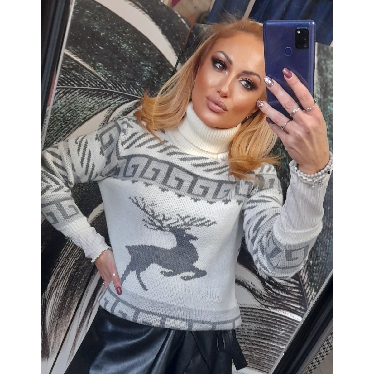 Maglione misto lana con collo alto, fantasia natalizia con renna, vestibilità slim, lunghezza standard. Taglia unica