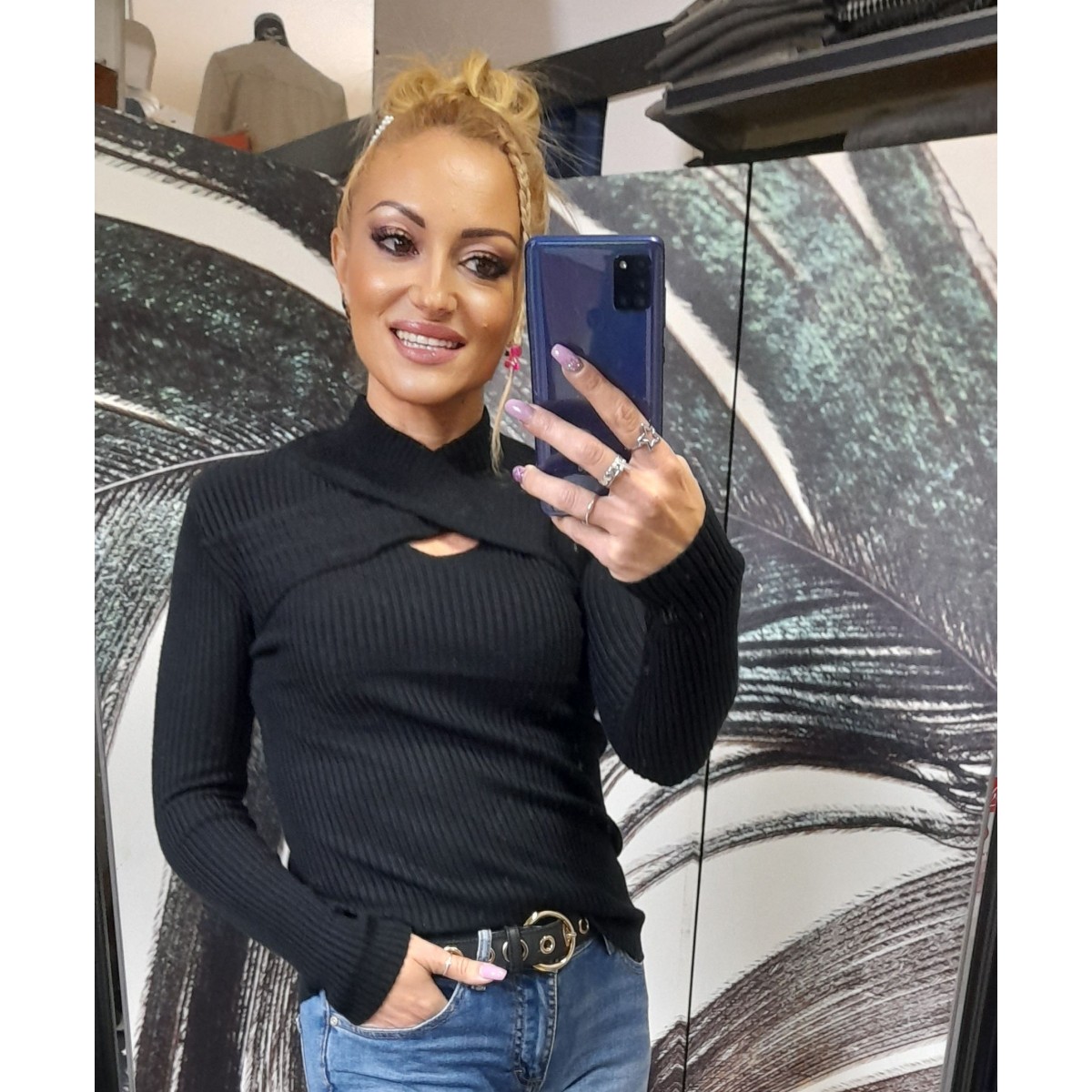 Maglioncino primo peso con collo alto con cerniera e spalle scoperte, vestibilità aderente. Taglia unica