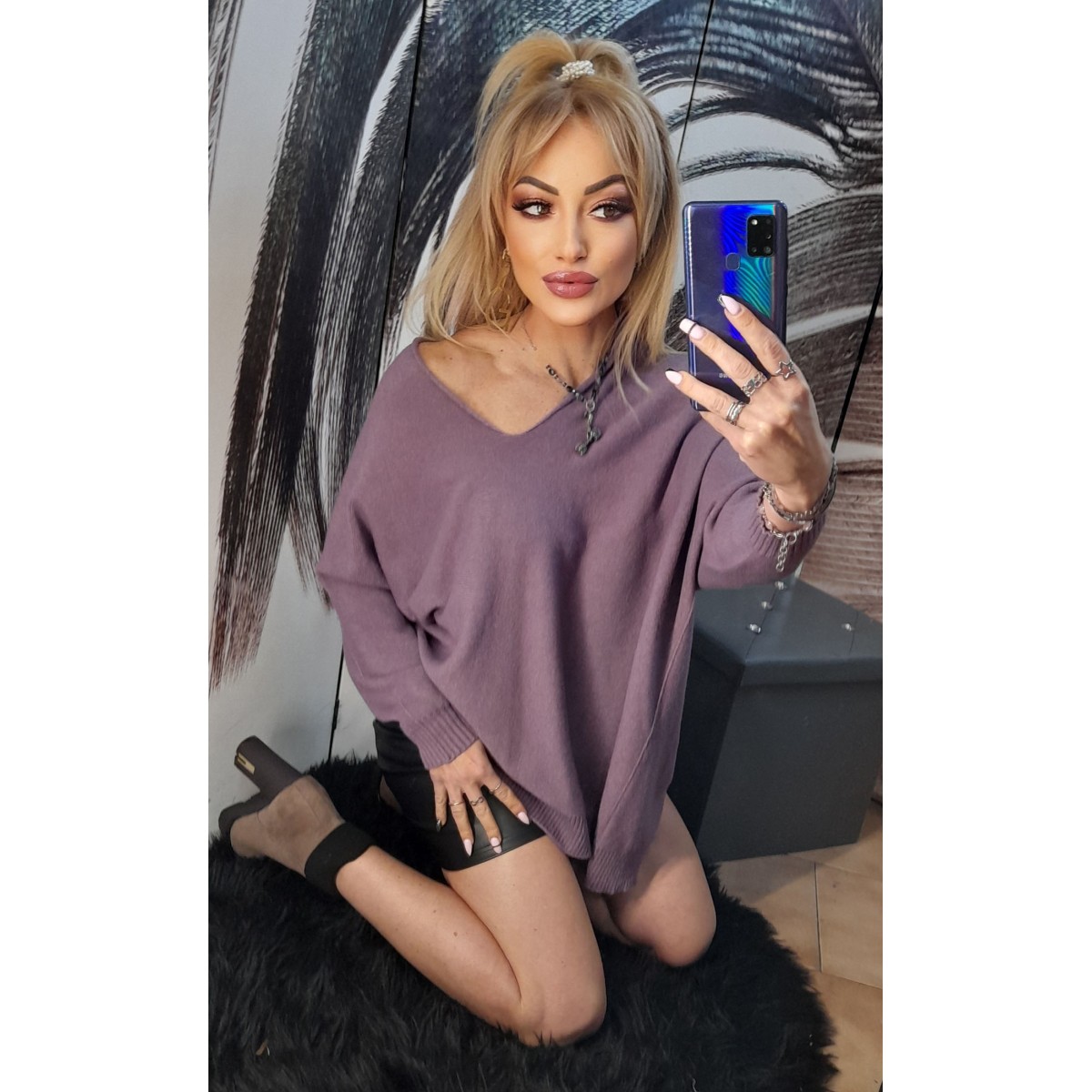 Maxi pull di lana con scollo a V | Selly Maxi pull di lana traforato con profondo scollo a V, vestibilità molto morbida, perfetto da indossare su un paio di leggings, disponibile in diversi colori. Taglia unica