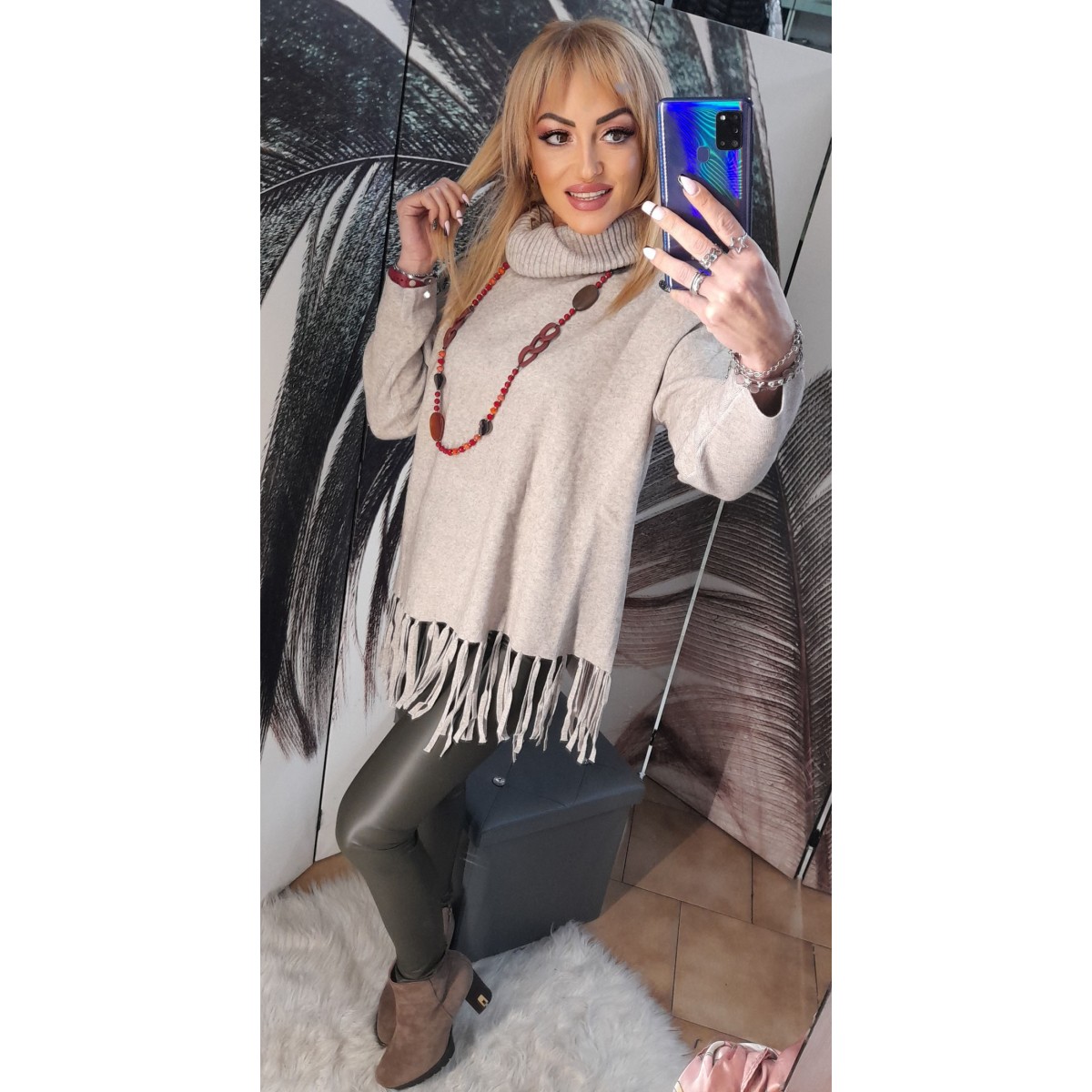 Maglione misto lana, vestibilità morbida con collo a dolcevita, le frange sulla parte finale danno un tocco originale al modello. Taglia unica
