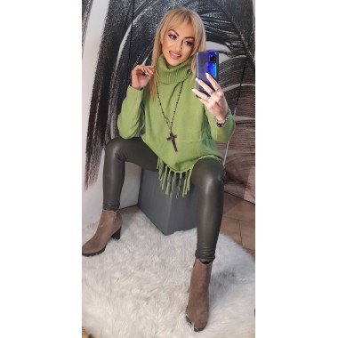 Maglione misto lana, vestibilità morbida con collo a dolcevita, le frange sulla parte finale danno un tocco originale al modello. Taglia unica