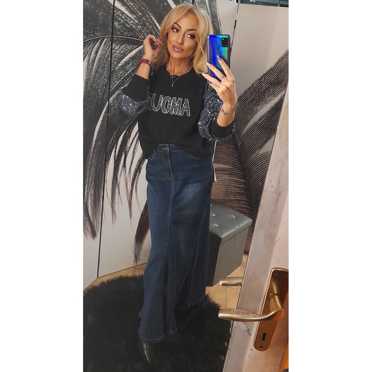 Maglioncino primo peso con scritta AMOUR sul davanti, girocollo, maniche con doppio colore e strass. Chic ed elegante. Taglia unica