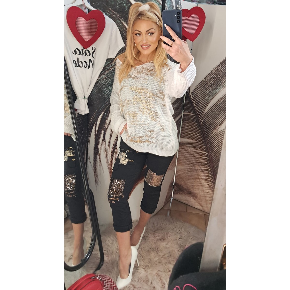 Maglioncino di cotone con ampio scollo a V, spalla scoperta, inserti in oro, vestibilità morbida. Taglia unica