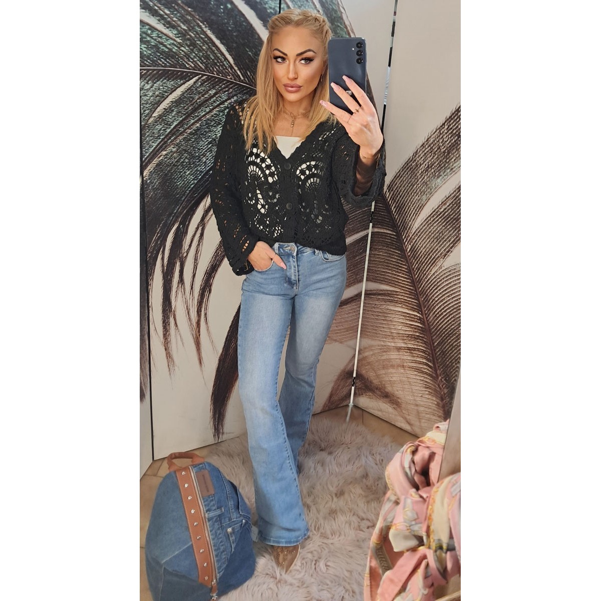 Cardigan con bottoni in pizzo macramé, spalla scoperta, vestibilità morbida. Taglia unica.