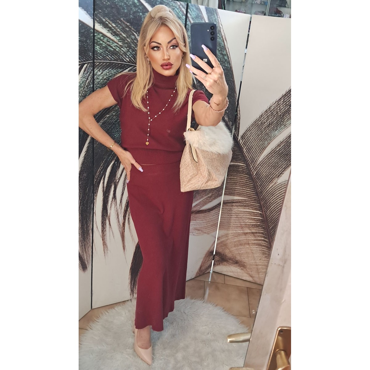 Completo in lana composto da gonna lunga aderente con mini pull a maniche corte, scollo a lupetto. Taglia unica
