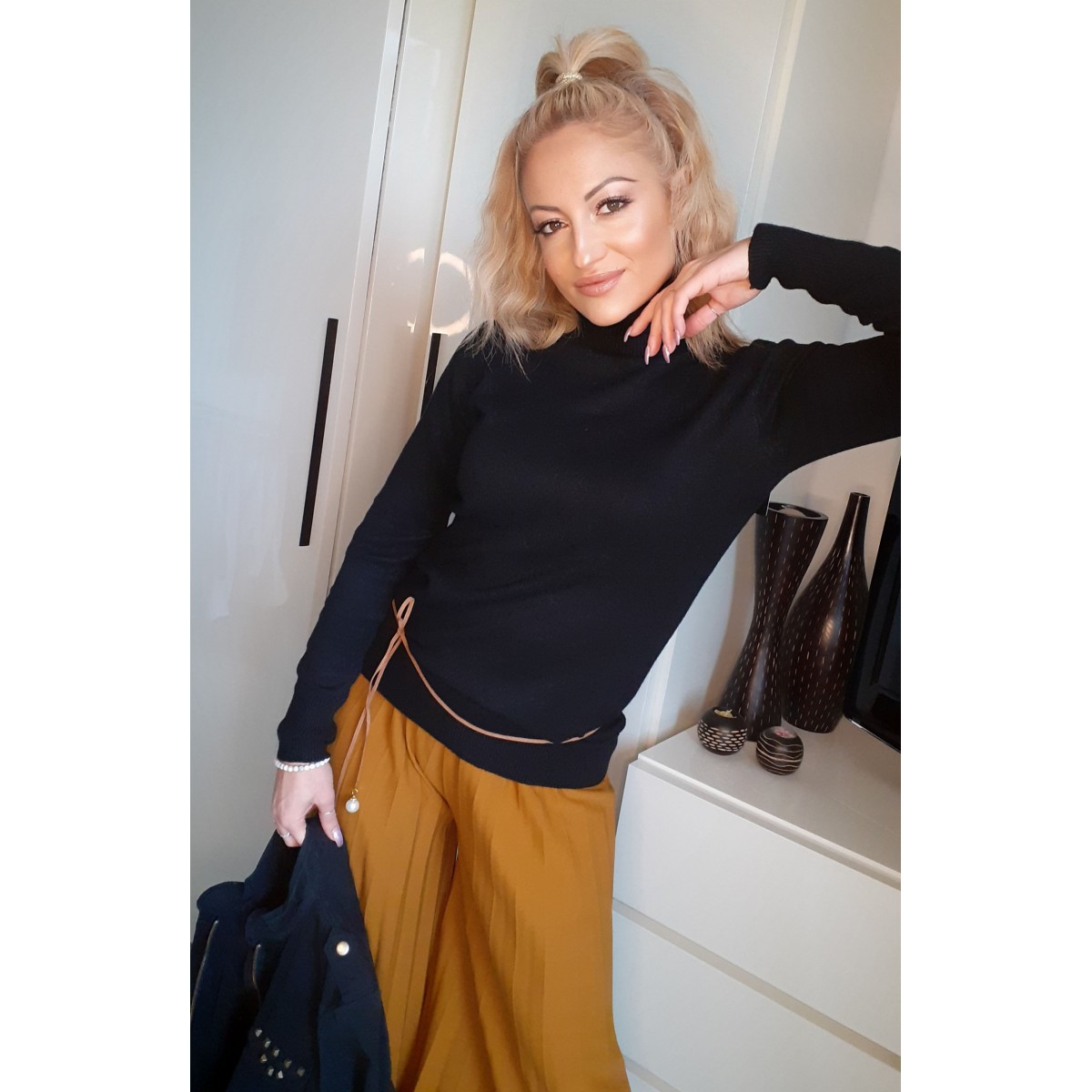 Tuta elegante chic in misto lana con pantalone morbido modello campana e mini pull con scollo tondo, vestibilità morbida. Taglia unica