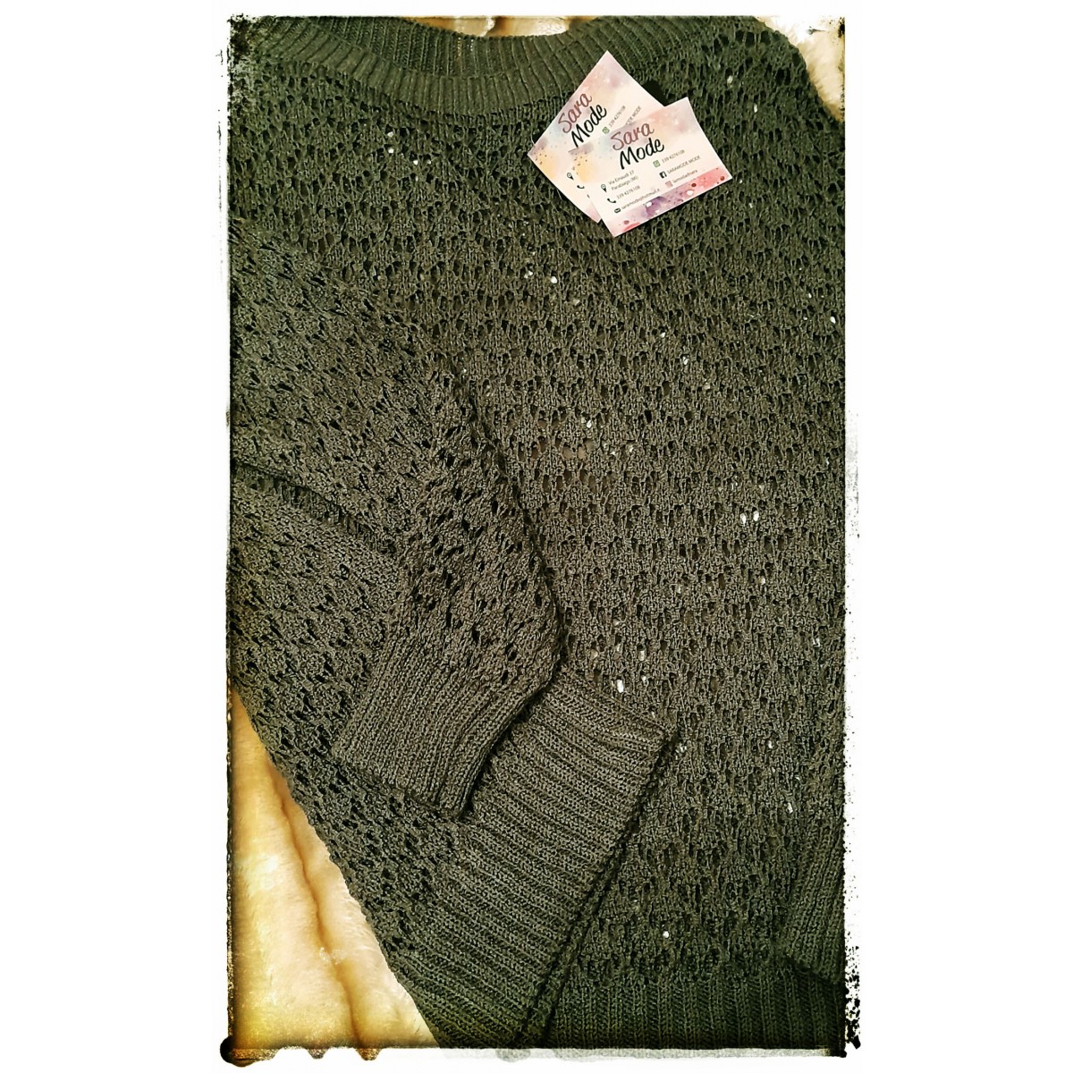 Maglione di cotone con lavorazione traforata, scollo a barchetta, vestibilità morbida, leggermente trasparente, lunghezza standard. Taglia unica