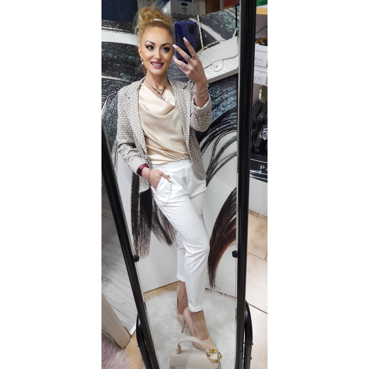 Completo giacca e pantalone a fantasia geometrica | Genny Completo giacca a tre quarti foderata con bottoni e due finte tasche laterali, pantalone a sigaretta con due tasche a fantasia geometrica, modello molto particolare e chic. Taglia unica S/M